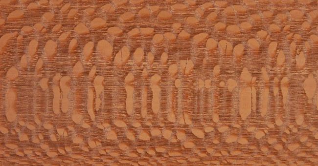 Le duramen est brun à brun rougeâtre avec parfois une petite nuance rosée. Lorsque le bois est coupé radialement, de petites taches en argent dessinent un motif très frappant et remarquable. L'aubier mesure quelques cm de large et est facile à distinguer. Le bois fraîchement scié dégage une odeur désagréable, qui disparaît avec le temps. Le fil est droit, parfois irrégulier et contient de la résine.