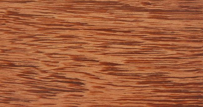 La couleur du duramen va du rouge brique au rouge foncé (brun). Le parenchyme, de couleur plus claire, fait naitre un joli motif rayé. L'aubier se distingue facilement. Cette essence possède un fil principalement droit, parfois imbriqué. Sa texture est grossière et présente parfois des défauts issus du bois de compression.