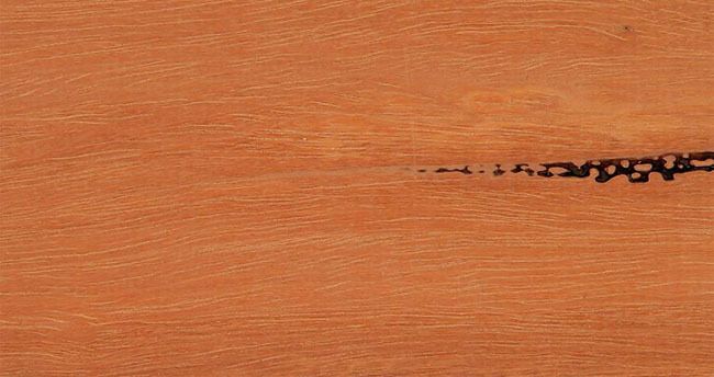 A cor do cerne é amarelada a marrom avermelhada, às vezes com listras mais escuras. As veias mais escuras da gengiva, aparecendo na superfície como linhas escuras, são características. O alburno é de cor mais clara e pode ser facilmente distinguido. O grão é reto, às vezes entrelaçado. A textura é grosseira média.